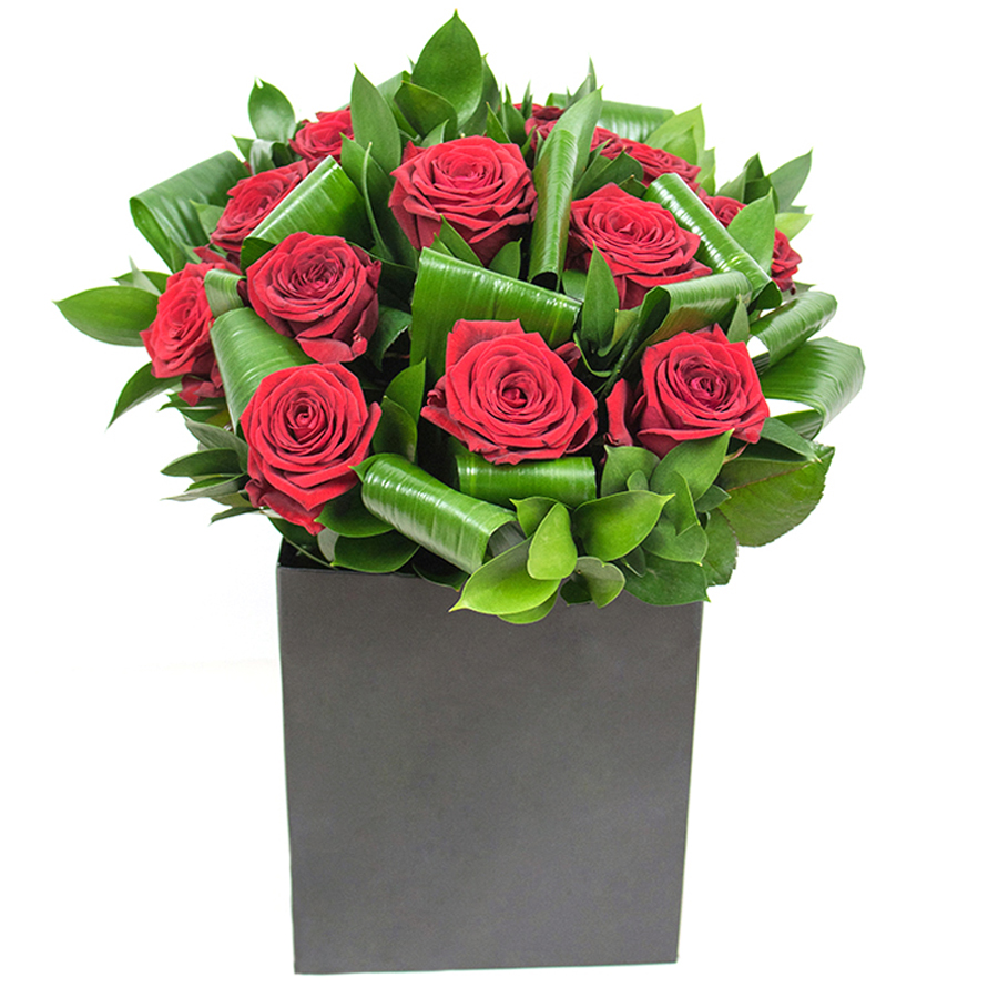 Celebrate beauty and elegance with our stunning flower arrangement, expertly designed to impress. This luxurious bouquet features a captivating mix of red roses, aspidistra leaves, and ruscus, carefully arranged to create a visually appealing and unique display.