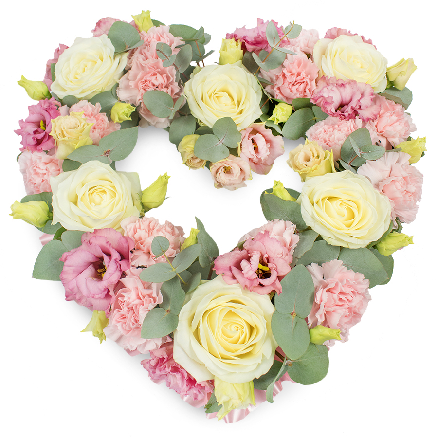 Express your deepest sympathy with our Elegant Heart Tribute Bouquet, a stunning arrangement designed to convey love and remembrance. This unique bouquet features vibrant white roses, delicate pink carnations, graceful pink lisianthus, and lush eucalyptus leaves, thoughtfully combined to create a harmonious display of colors and textures.